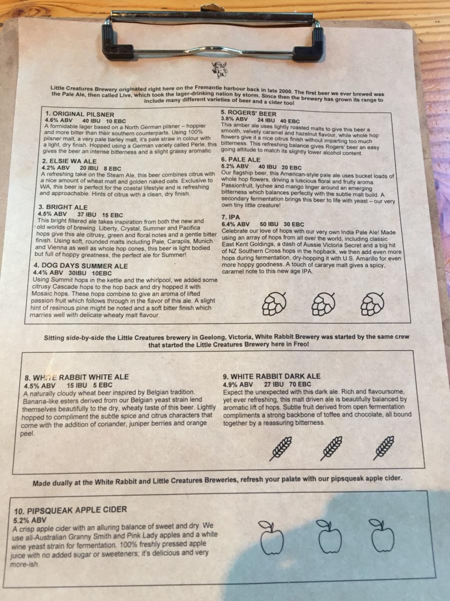 Was natürlich auch sein muss, wenn man hier ist; ins Little Creatures gehen, um die vielen australischen Biersorten kennenzulernen. Marco hat das natürlich gleich mittels einem Biertasting umgesetzt.